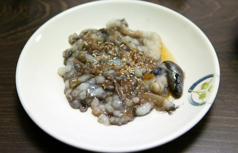 Eight-legged and squirmy, the octopus is a Korean delicacy that's eaten alive. It's believed that the live sea creature will build the strength and stamina of the person eating it. Koreans also like the sensation of the suction cups on the octopus' legs as they stick to their mouths. Chopped into pieces or wrapped around chopsticks and eaten whole, the octopus won't go down without a fight and can be deadly. Adventurous eaters should be careful when swallowing a live octopus as it's easy to choke on it. Its over 1,000 still-active suckers can stick to your mouth and its tongue and tentacles can get stuck between your teeth. The octopus may even try to climb back up your throat. To avoid choking, it's recommended to chew before swallowing.