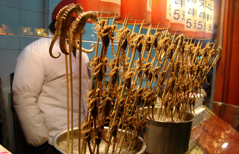 In China, there's an old saying that goes, "Eating sea horses keeps that 80-year-old granddaddy young." Respecting this proverb, the Chinese enjoy seahorse — which has a squid-like consistency and is extremely salty — as an everyday food, often prepared whole in soups with pork and dates or eaten on a kebab. It's said that Emperor Tangminghuang, known as one of the most popular emperors of China, drank sea horse-infused liquor later in life. Be careful, though, when eating a seahorse because sharp pieces of it can get caught in your teeth and gums.