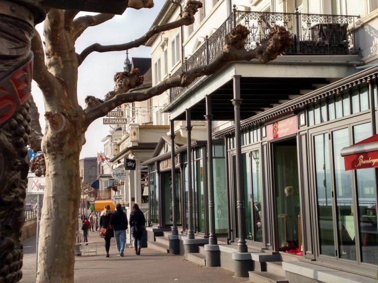 While strolling along Bingen's pedestrian riverfront walkway, you're sure to see a well preserved, over-500-year-old freight crane that also lights up at night. Right next door is the German steakhouse Zollamt, occupying a former customs office built in 1906. The menu here specializes in "shockheated" Kobe and other prime cut steaks sizzled in a uniquely designed grill/oven combo that sears meat at up to 1400 degrees Fahrenheit via an intense combination of convection and open fire; a tasty, dark outer crust with an extremely tender and juicy interior make it to your plate every time. Weather permitting, their spacious outdoor terrace overlooks Castle Ehrenfels, the Niederwald Monument, and Rüdesheim across the river.