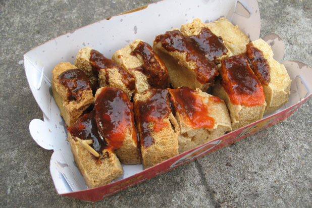 There's no sugarcoating it with this one; stinky tofu is exactly that: stinky. In fact, stinky tofu is so stinky that it is famous for being the only food Andrew Zimmern can't swallow. Stinky tofu, which has been playfully called the "blue cheese of tofu," is a fermented tofu dish that is popular in China, where it is both a street food snack and a stadium snack, and has a cult following in Taiwan. (Photo: Flickr/Gary Soup)