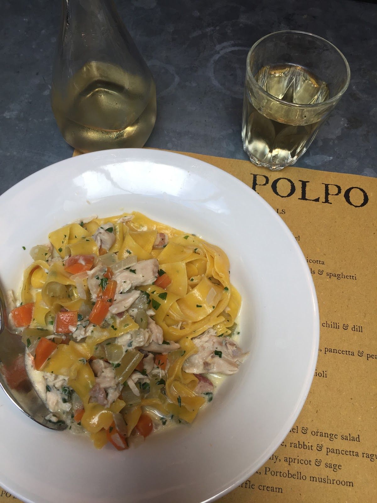 I end up at Polpo on Maiden Lane for an unplanned lunch. Polpo is a chain that doesn't seem like a chain. Unpretentious Venetian small plates backed up by an Italian wine list chosen, as are all the best Italian wine lists, by a fascisti. He buys what he likes — and we are all the beneficiaries. Just why do they serve them in tumblers? That is too authentic. The marinated baby octopuses, artichoke, and fennel seeds are just as good as they would have been if they had been called octopi (which one is correct is Greek to me — and to you). The dish is chewy but not rubbery, and elevated by the tart artichoke. Also good is fresh pappardelle, rabbit, and pancetta ragu.