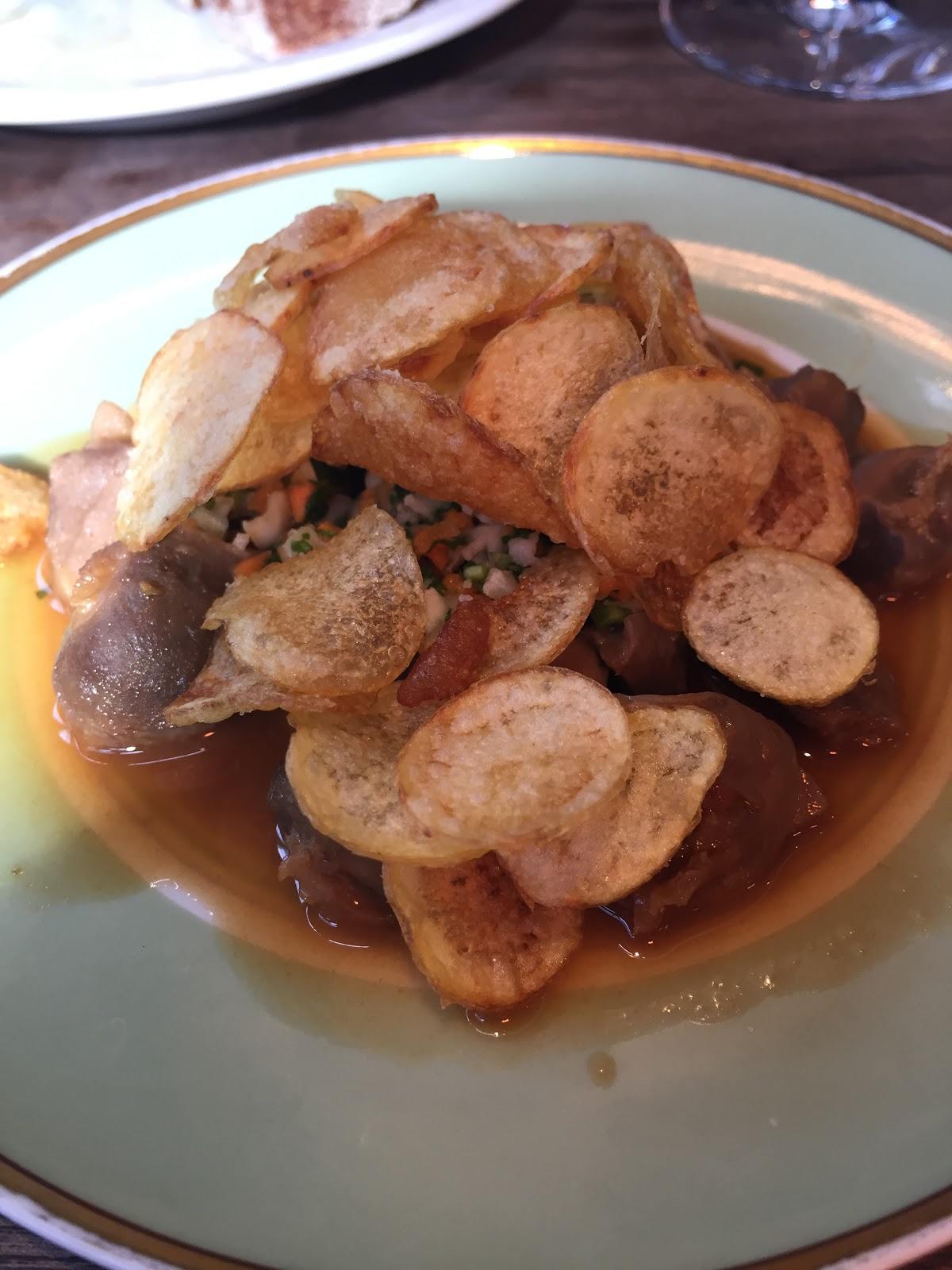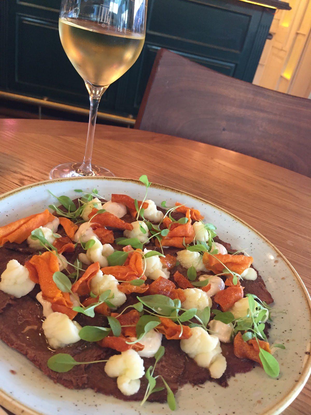 Lunch today calls for a quickie, squeezed between Ove Arup Engineering The World and a superb walking tour of hidden rivers with Stephen Benton of Footprints of London. I am on a Spanish kick after the experience of Eneko, so I pop in, unplanned, to Ibérica Victoria. My waiter works with me to get me out in double quick time, fed and watered. It is beef cheek carpaccio finely sliced and topped with truffle potato purée, sweet potato crisps, and tartare sauce for binding. It is ethereal, even more so with a glass of albarino.