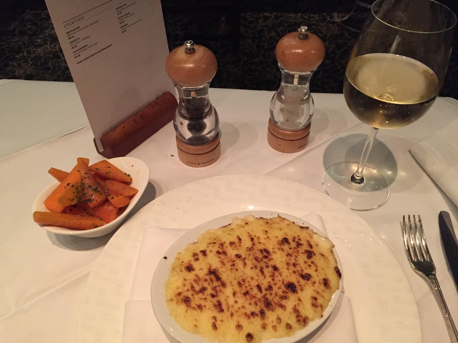 I have dinner at The American Bar at The Stafford. The USA section of the menu has favorites like BLT, corn dogs, and mac and cheese, but I go for the traditional and underappreciated fish pie. Salmon, prawn, and whiting are cooked under a lid of au gratin potatoes. It is simply heartwarming.