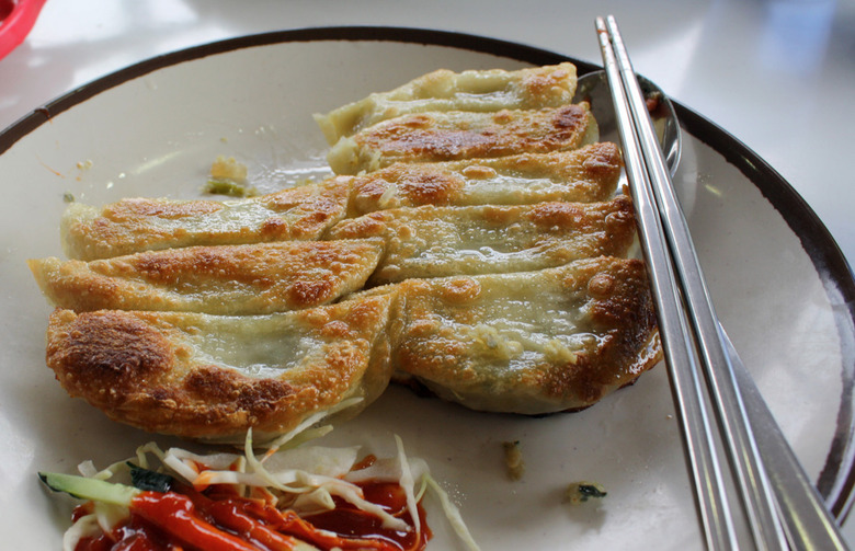 These circular Korean dumplings are often filled with a mixture of beef and pork, as well as kimchi, a side dish of fermented vegetables. Popular ingredients in Asian cuisine like bean sprouts, glass noodles, and ginger are also incorporated into the filling.
