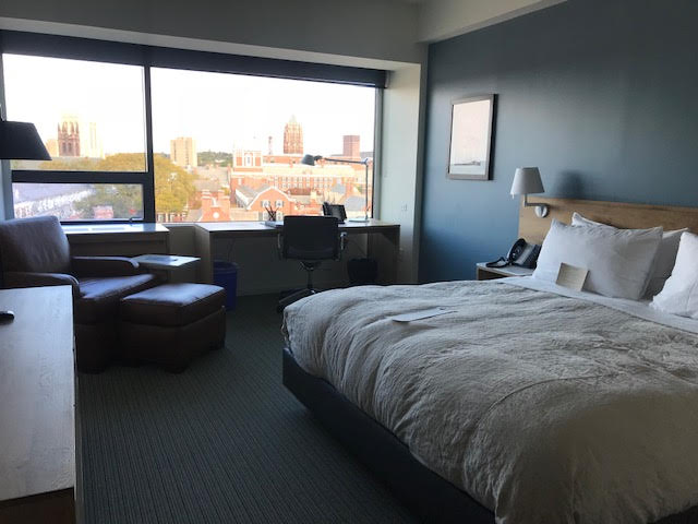 After a quick train ride from New York City (about an hour and 40 minutes) and a brief cab ride, we checked into our hotel, The Study at Yale, which we'd strongly recommend. It's a short walk from the New Haven Green and is located right in the heart of Yale's campus, so not only are you just a short jaunt from all of Yale's theaters and museums (including its legendary Yale University Art Gallery), your hotel room might also provide a spectacular view of the campus and its Federal-style architecture. The hotel is sleek and modern, our room was bright and cozy, and the hotel's restaurant, Heirloom, is a favorite among locals and visitors alike (more on that later).