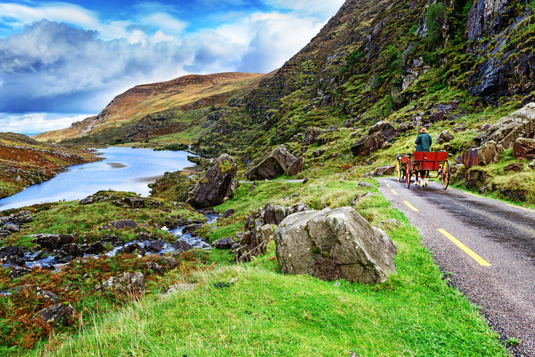 Between the MacGillycuddy's Reeks mountain range and Purple Mountain in the South-West Region of Ireland lies the Gap of Dunloe, a narrow mountain pass that provides breathtaking scenery. Either ride a pony down the narrow winding road here or take a jaunting car, a sort of horse-drawn carriage in which four passengers sit facing each other.