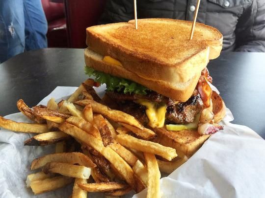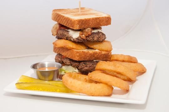 Tipsy Cow Burger Bar feeds your alter ego. Here is what they have for the rock star hiding within: a 7-ounce patty topped with brew-battered and fried bacon, maple syrup, white cheddar, fried egg, caramelized onion, and lettuce and tomato, of course.