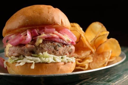 At Spats Food & Spirits, the Irish weigh in with their own burger here topped with corned beef and sauerkraut.