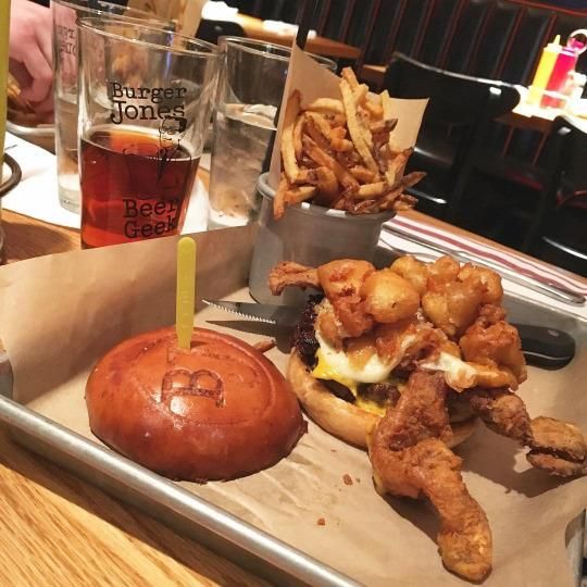 Burger Jones has some good-looking burgers on the menu, but our attention focused on something called the White Trash Double Wide topped with chicken-fried bacon, fried cheese curds, and Velveeta.