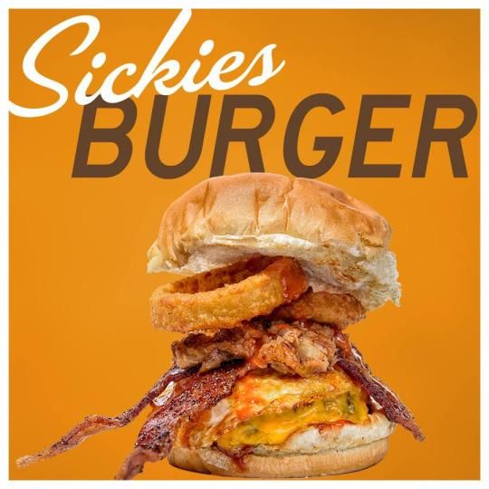 Sickies Garage has a signature burger that combines breakfast and lunch unlike any brunch we have ever encountered. The burger comes topped with bacon, fried egg, pulled pork, BBQ sauce, and onion rings. Is that one meal or three?
