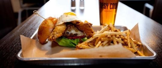 Tipsy Cow Burger Bar feeds your alter ego. Here is what they have for the rock star hiding within: a 7-ounce patty topped with brew-battered and fried bacon, maple syrup, white cheddar, fried egg, caramelized onion, and lettuce and tomato, of course.