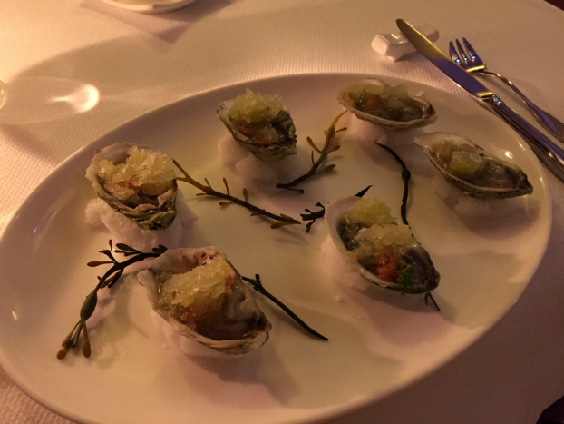 I opted for the tobacco-smoked rabbit with ravioli and brown butter emulsion to start, which was delicate and not at all gamey. We also shared oysters on the half shell topped with a green tomato granité, spicy radish, and finger lime, which are sourced from a local oyster farm whose owner told the Seasons that their preparation was the absolute best he has ever had, and I have to agree with him.