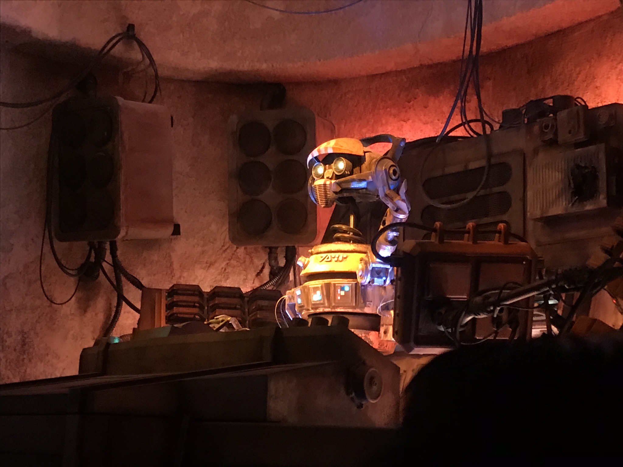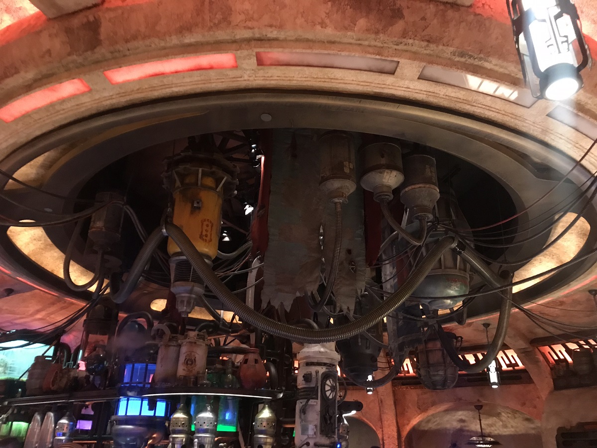 The most marvelous part of Oga's Cantina's décor and atmosphere is the droid, DJ R-3X. Disney fans will remember him from long ago when he piloted the Star Tours attraction. But now, the perky little robot is back, playing hip tunes from the Star Wars galaxy. The music is lively and thumping, and while none of the songs are recognizable, they all have a party element that reminds you of something that you maybe heard once before. From time to time, DJ R-3X will malfunction and start his Star Tours spiel. But in a matter of moments, the cantina employees will whip out a hammer and bang on some pipes, and the party starts all over again.