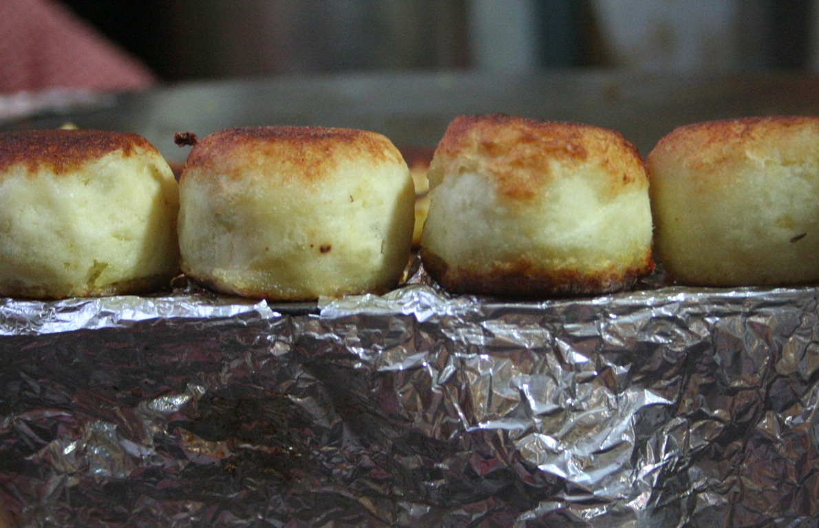 Dabeli looks like something you might find at a dim sum lunch, but it is actually an Indian snack food from Gujarat. The potato patties are mashed with dabeli masala (chiles, coriander, cinnamon, cloves, and cumin), then served inside a bun with tamarind chutney, roasted peanuts, sev (crunchy chickpea noodles), and pomegranates.