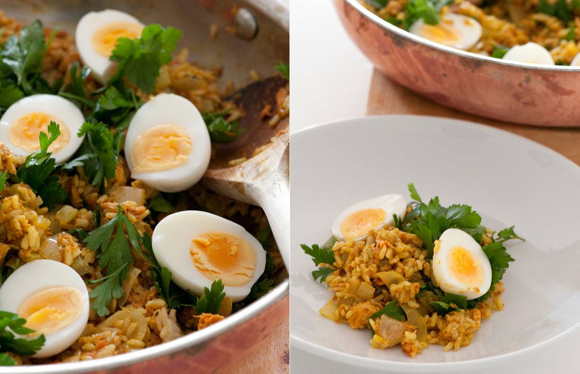 Kedgeree is an Anglo-Indian dish that is almost a perfect blend of very Indian (rice and curry powder) and very British elements (haddock). Parsley, hard-boiled eggs, cream, and sultanas are usually added.
