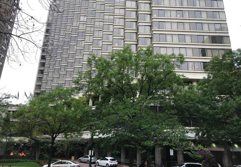After checking in, we headed up to our room, one of the many park-facing rooms that have been uniquely constructed to essentially have a corner window that looks out onto the park. It was super-spacious at around 500 square feet, and recently renovated with a pleasing color scheme, a table with two comfortable chairs, a corner workspace facing the windows, an absolutely massive television, and a sideboard with a Nespresso machine, mini bar, wine glasses, and ice bucket. The bathroom was also pretty stunning, loaded with marble and with a large tub and walk-in shower. Between the bathroom and bedroom was a vanity and dressing area, with a large closet. WiFi was complimentary (a nice touch), and there was thankfully no shortage of plugs, including ones on each nightstand (lighting controls for the room were also on each side of the bed, also welcome). Evening turndown service was offered at night, and there were several other hallmarks of a luxury hotel available, including overnight shoe shine, super-comfortable bathrobes and slippers, and 24-hour in-room dining.