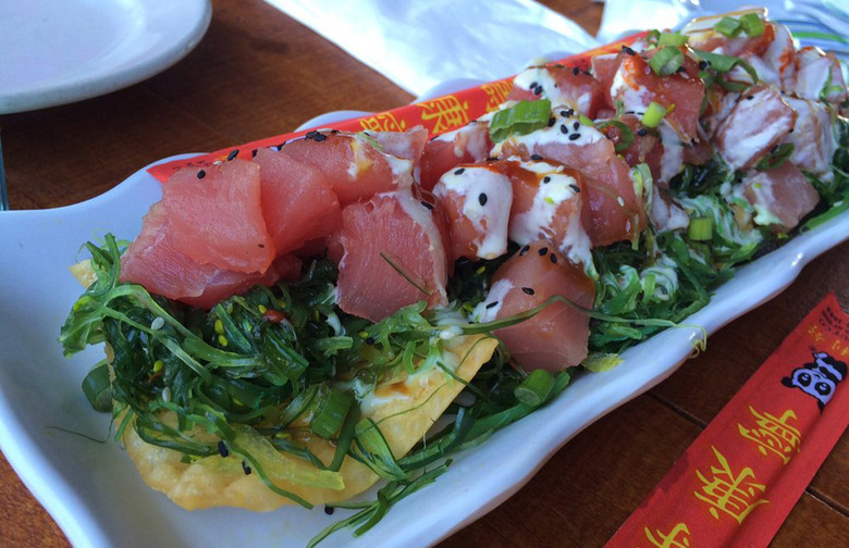 The signature dish is the original tuna nachos featuring Ahi grade tuna on a bed of sesame seaweed salad over crisp wontons, topped with wasabi drizzle, sesame seeds, sweet soy, sriracha and scallions.