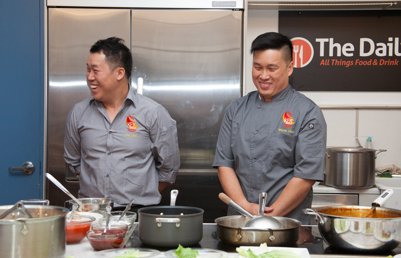 Chef Wayne Liew and his brother Paul Liew share a laugh during their crab demo.