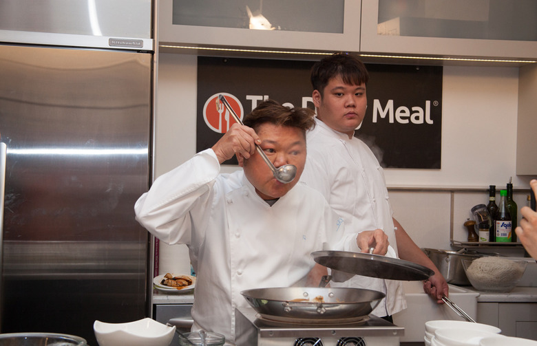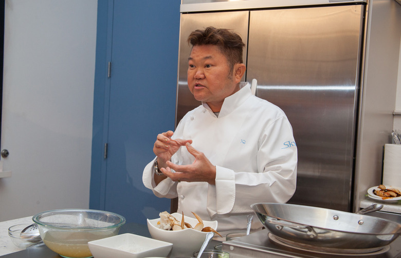 Chef Justin Quek demonstrates the proper way to make Singaporean crab broth.