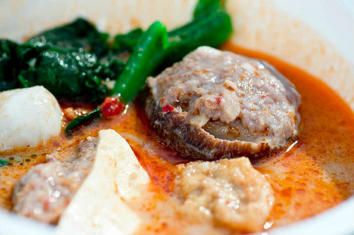 Tofu stuffed with minced pork and vegetables in Laksa curry broth.