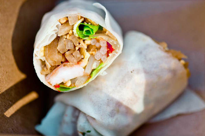 Spring roll with braised jicama salad, egg ribbons, Chinese sausage, shrimp, bean sprouts and crushed peanuts.