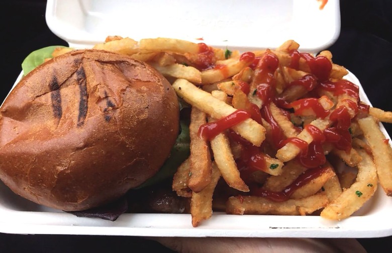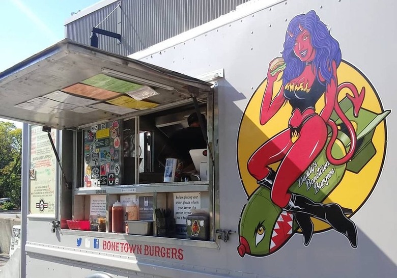 Daddy's Bonetown Burgers serves juicy burgers out of its truck, which features a large decal of a high-heeled boots-wearing, bikini-clad woman in the form of a devil, sitting on a shark-shaped rocket and eating a burger. It's very much the Guns N' Roses brand of rock and roll. But how do the burgers stack up? People love them. Whether you order the "Kick Out the Jam," their 100 percent Angus burger with pickled red onions, bourbon bacon jam, and Monterey Jack cheese, or the "Richard Simmons," a black bean and quinoa burger with cilantro aïoli and Cheddar, consider yourself welcomed to the jungle (of flavor).