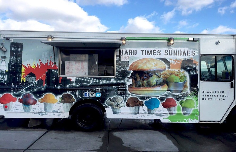 Counter to the food truck's name, they don't serve sundaes. They do, however, serve amazing burgers, hot dogs, and sides. The burgers are made as a single, double, or triple with classic American cheese and any toppings you'd like (bacon and chili are extra). There's only one hot dog on the menu: Brooklyn-style hot dog, deep fried. You can add any topping to that as well, or wrap the entire hot dog in bacon for an extra $4.