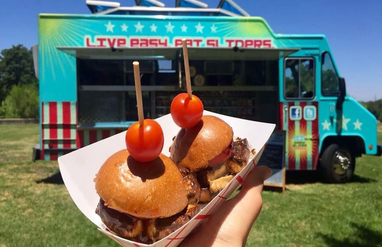 With perhaps one of the cleverest food truck names on this list, Easy Slider serves creative mini burgers that use certified Angus beef and farmers market produce out of their red, white, and electric blue vehicle. They introduce sweet flavors into savory sandwiches in not-too-sneaky ways: by using strawberry jam in their burger with bacon and goat cheese, peanut butter instead of cheese in their bacon burger, and sea salt caramel with grilled red onions in their Sugar Derby burger. You don't want to miss their Baby Bella, with a Texas-born portabella mushroom patty topped with the basic components of a caprese: mozzarella, tomato, and basil pesto.