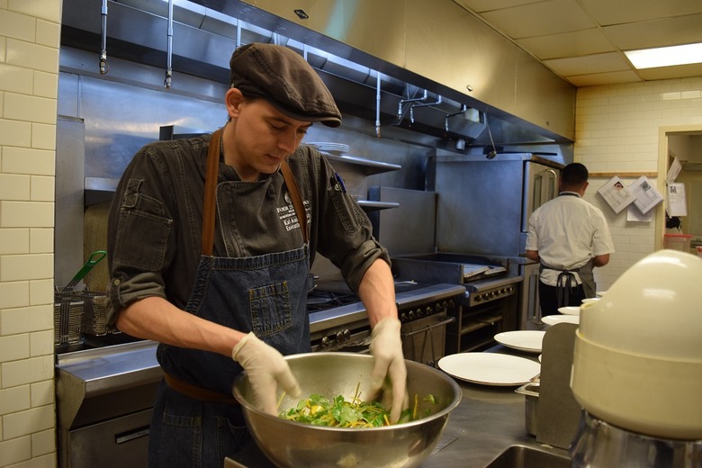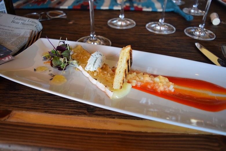 After our second home-hunted elk course in 24 hours, Autenrieth brings the meal to an end with a dessert course of Brie brûlée with melon slaw, chile jam, grilled brioche, and honey-coated pine nuts, served with a Vivac refosco from grapes shipped north from Paolo D'Andrea's vineyards.