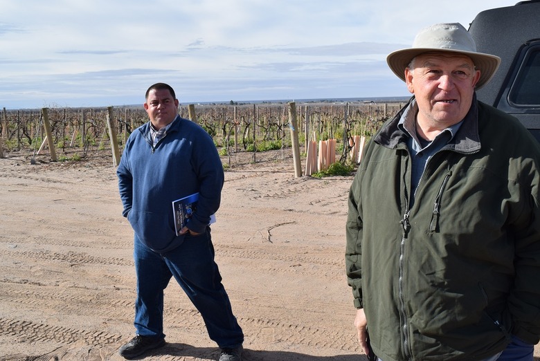 We take a tour of the Amaro Winery vineyards with owners Bennie (left) and Bernd Maier, who explain that Spanish priests brought grapevines to New Mexico in 1629, long before they reached California. The poor soils are great for vines, but irrigation is necessary. Spring frosts are always a worry.