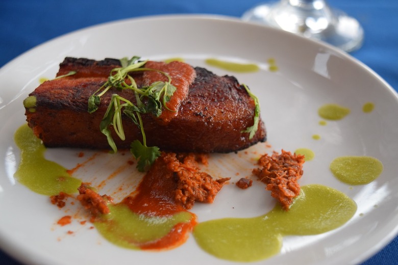 That evening at Salud! de Mesilla, chile grower Chris Franzoy of Young Guns Produce tells us what's hot and what's not with New Mexico's go-to vegetable, while chef/owner Russell Hernandez treats us to crispy pork belly with red chile sauce and pipián made with the local go-to nuts — pecans.
