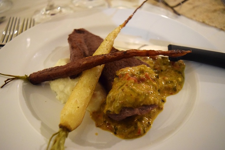 Dinner has two stars — chef Mashon Swenor of Hunt & Harvest restaurant, who prepared this local elk, sous-vide, with three-cheese cauliflower mash, carrots, and green chile crème, and Noisy Water's Jasper Riddle, who shot the elk and made the cabernet-zinfandel blend we drank with it.