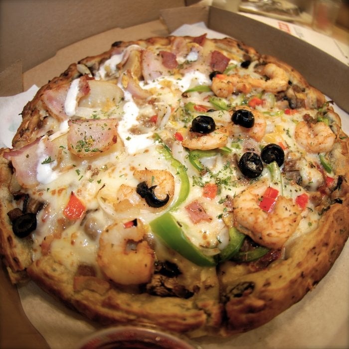 The Grand Prix Cookie Crust Pizza, topped with shrimp and sweet potato, is served by the Mr. Pizza chain in South Korea. If you can't make it to South Korea, you can try it at Mr. Pizza in Los Angeles.