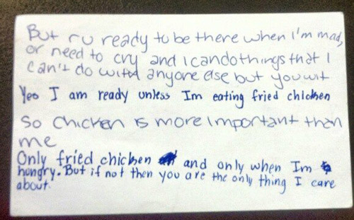 In this adorable note picked up in an eighth grade classroom, one special someone wrote, "But r u ready to be there when I'm mad, or need to cry, and I can do things that I can't do with anyone else but you wit." The answer? "Yes I am ready unless I'm eating fried chicken." Now that's true love <3.