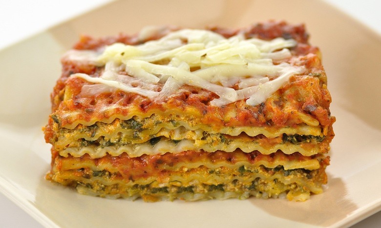 - Wash spinach carefully and chop coarsely. You should have about 2 well-packed cups of chopped spinach. Chop the onion and saute it lightly in the olive oil with the minced garlic. Combine the Ricotta cheese, grated Romano, spinach, sauteed onion, beaten eggs, and mix well. Season the mixture with a little salt, plenty of fresh ground black pepper and some chopped parsley. Grate the Mozzarella coarsely and cook the lasagne noodles until they are just al dente. Now you are ready to assemble the lasagne. Butter a large, oblong baking dish, or two smaller square ones. Arrange a layer of lasagne noodles in the bottom, then spread on a layer of Ricotta cheese mixture, sprinkle that with Mozzarella, and cover it over smoothly with tomato sauce. Repeat these layers once or twice more, until everything is used up. Be sure to end with sauce on top, regardless of whatever is directly beneath it. Cover the baking pan with aluminum foil, crimping the edges tightly. Bake the lasagne at 350 degrees for 40 minutes, take off the foil cover, and bake it another 10 to 15 minutes uncovered. Serve very hot, with herb bread or garlic toast, and follow it with a very green, very crisp salad.