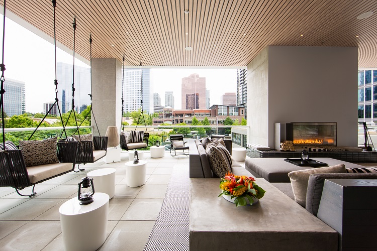 THE PORCH, aka the outdoor patio: The Porch is just a few steps away from the welcome home bar. There isn't anything more breathtaking than a city's skyline at dusk. The patio is surrounded by super comfortable and cozy sectionals, large porch swings with fluffy pillows, and a beautiful fireplace. I took a minute to grab a cocktail, sink into the sectional and watch the skyline as I breathed in the cool Bellevue air. So relaxing.