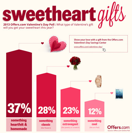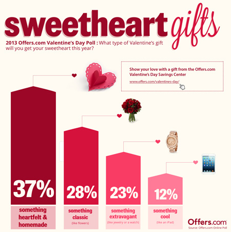 Offers.com has surveyed shoppers about what they plan on purchasing for the holiday of love, and results show that it's not all flowers and candy — it actually is what's from the heart that counts most.