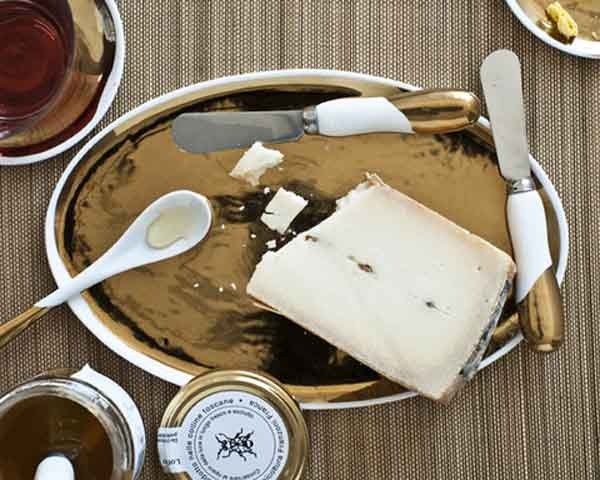 With a vast set that includes chargers, servers, trays, bowls, plates, and spreaders—the retro gold lining of each is an immediate scene setter that demands attention on any table, whether it's a casual sit down or a formal dinner party.