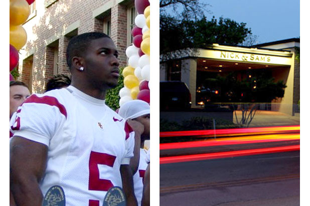 Nick & Sam's is beloved by NFL players because they always deliver dependable, quality steaks and chops, and the portions are huge. The menu boasts aged beef that starts at 16 ounces for the rib-eye and goes all the way up to three pounds for the porterhouse. Hall of Fame quarterback Troy Aikman is a fan, while Reggie Bush (left) scored a coveted table during Super Bowl weekend in February.