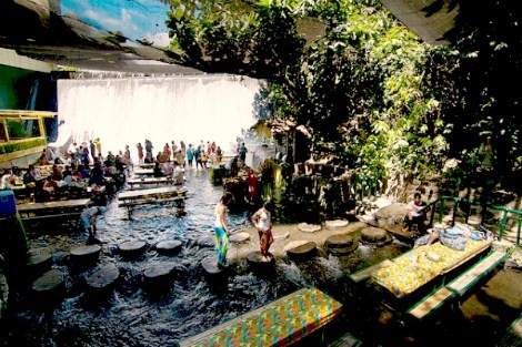 Hint: Featuring tables made of bamboo, this restaurant sits on a historic plantation that's surrounded by coconut trees, farms, and the lake that provides this waterfall.