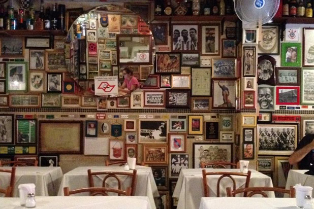 Lined wall to wall with soccer memorabilia from old newspaper clippings and photos — many of famous Brazilian soccer players like Pele, Zico, and Garrincha — to team jerseys and flags, this tiny bar in São Paulo gets crowded quickly with spirited fans. The bar offers a large selection of cachaça, a type of white rum from Brazil, as well as cachaça cocktails like "caipirinha," and on Saturdays, authentic "feijoada," a Brazilian dish consisting of mainly beans, rice, and pork.