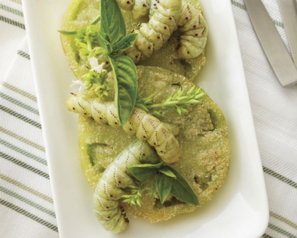 Admit it: This dish is beautiful. So if this is the new way to 'eat your greens,' count us in. Cornmeal-crusted fried green tomatoes, quickly sautéed hornworms, and fresh, bright green basil combine to showcase how striking a monochromatic plate can be. And the pairings don't stop there. The recipe calls for tomato hornworms, which feed on tomato leaves, and are full of fantastic flavor.